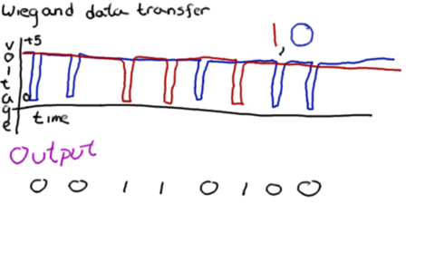 The reader uses a strange format - Wiegand - to transmit data. Wiegand was devised years ago for reading magnetic swipe cards, and has grown into a standard. Just like clock-and-data transmission, it uses two lines. There the similarity ends.