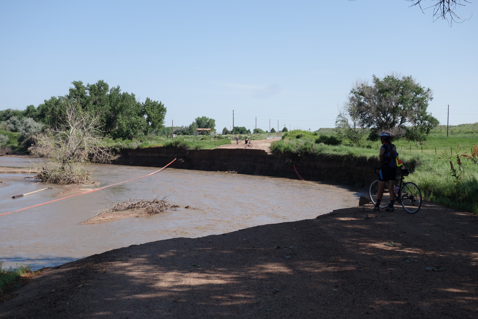 He wasn't wrong. After riding over five miles of gross wet clay-ish mud that clogged my brakes and caked my frame, the road vanished. Heavy rains and also some normal rain flooded a nearby river. The flood waters ate away at the road until there wasn't any road left. The signs said Road Closed. It could have said Road Missing.