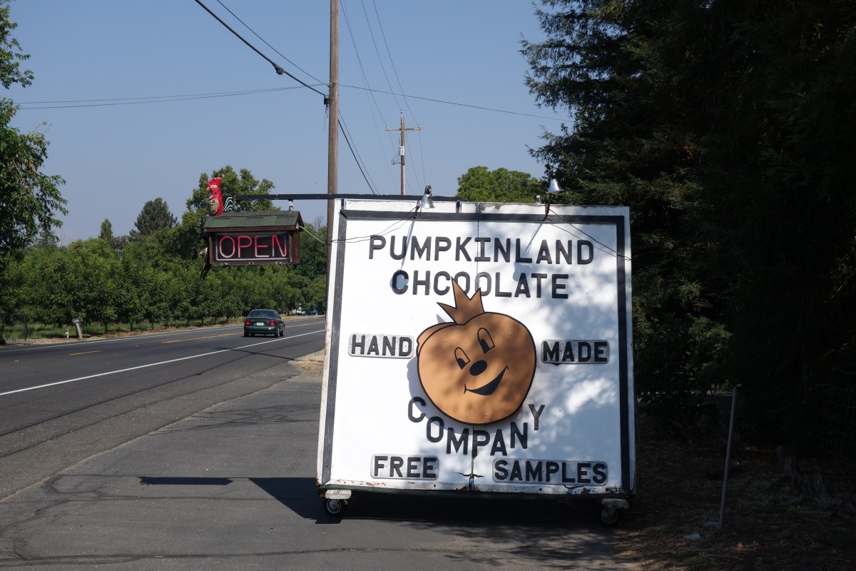 Wildfires and chocolate. That was today. In the morning, we packed up from camping overnight on the outskirts of Lassen Park, and began our descent (from 4800 feet to 140). Along the way, we passed a small wildfire (with lots and lots of trucks around) and Pumpkinland chocolate, which had delicious chocolates and ice cream (and some free samples!)