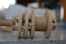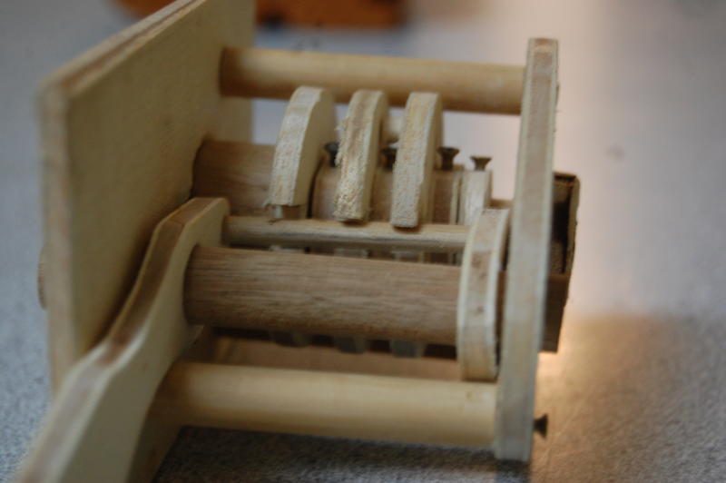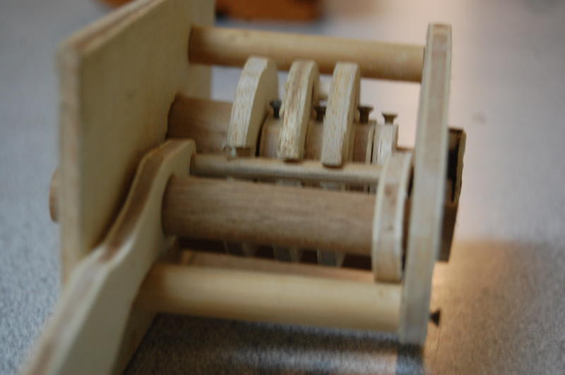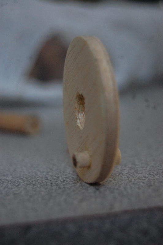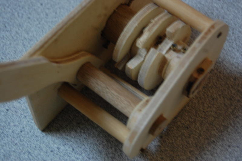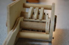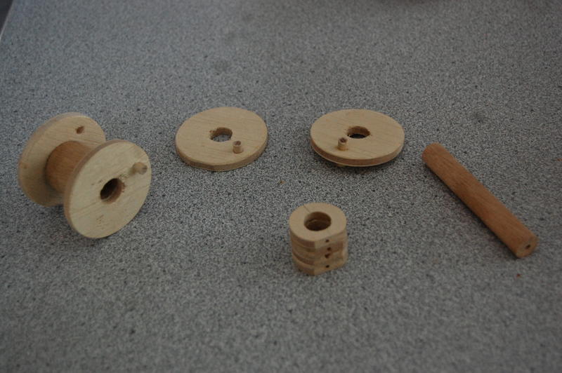After deciding on about half the dimensions, we started cutting. The tumblers and washers were first, then I popped a few dowels onto the lathe to turn them down a bit. When I finished, the tumblers spun smoothly on the central shaft.